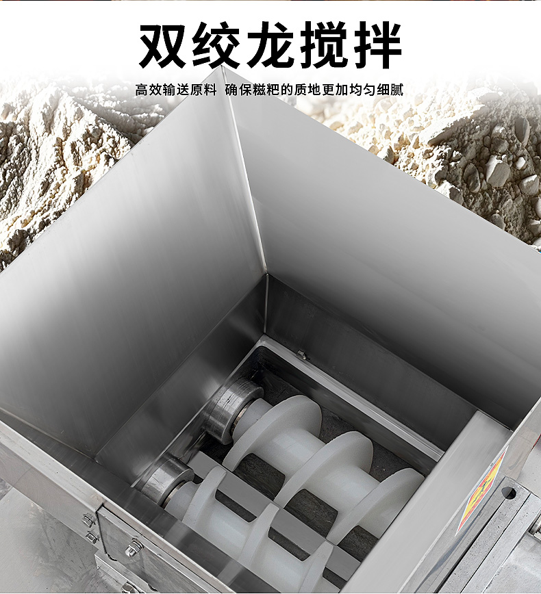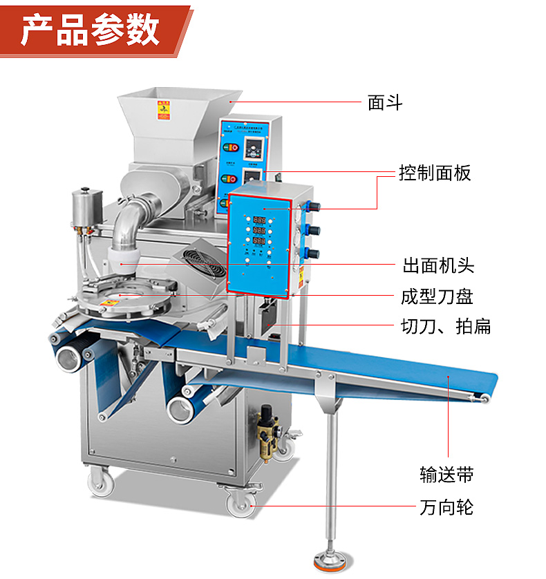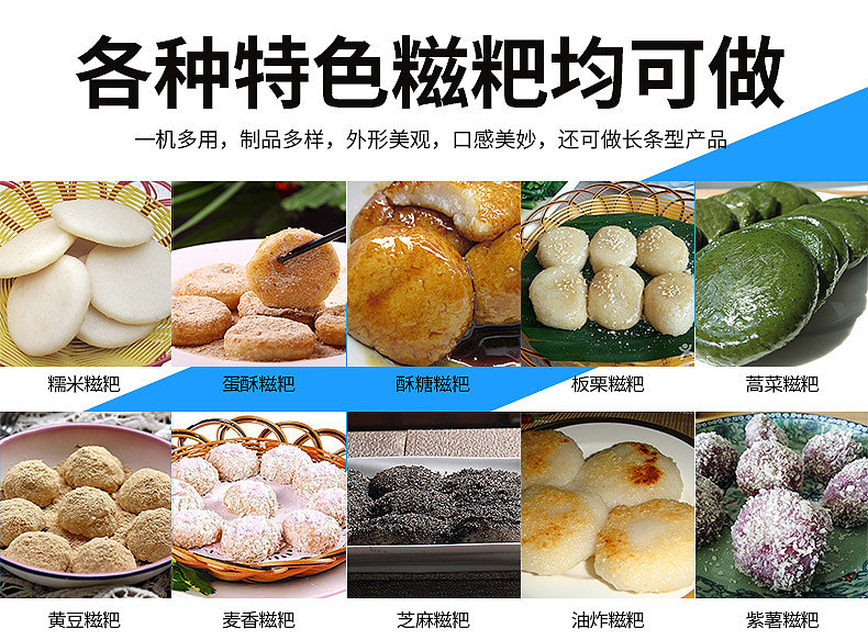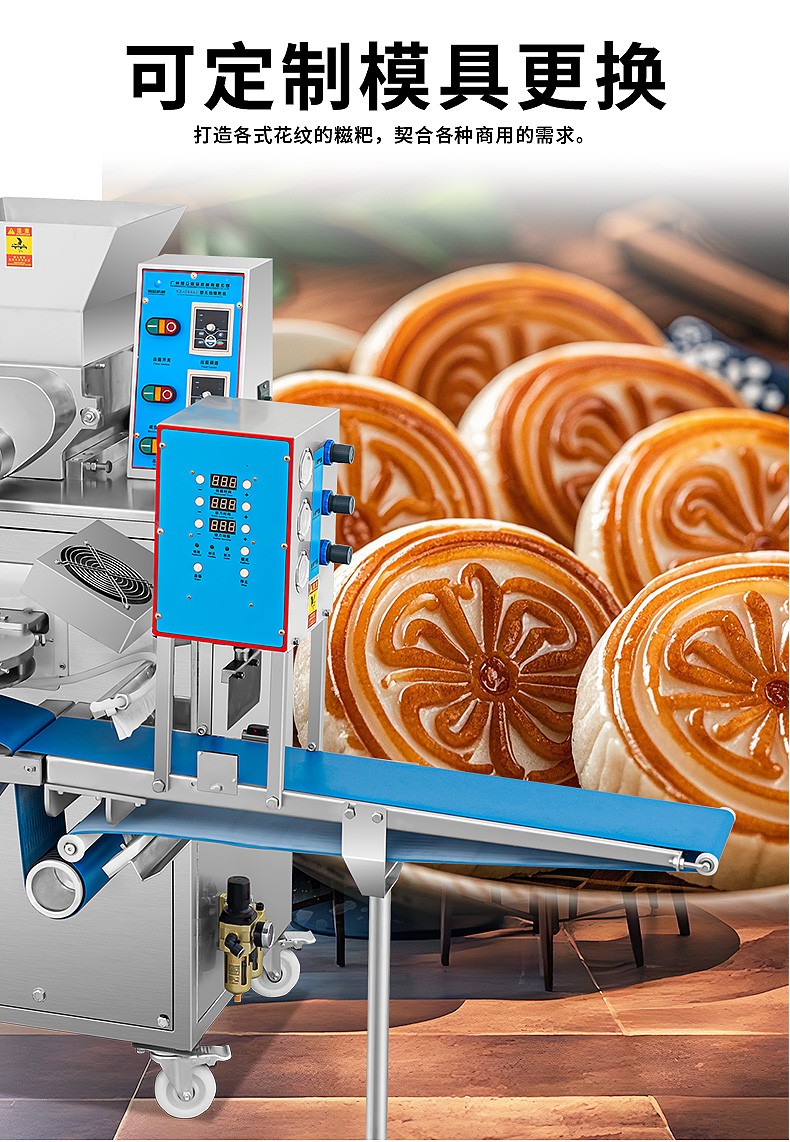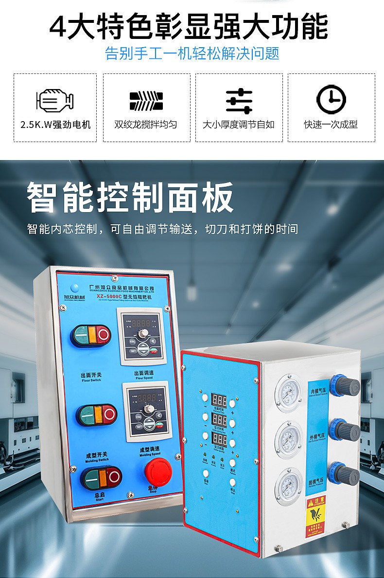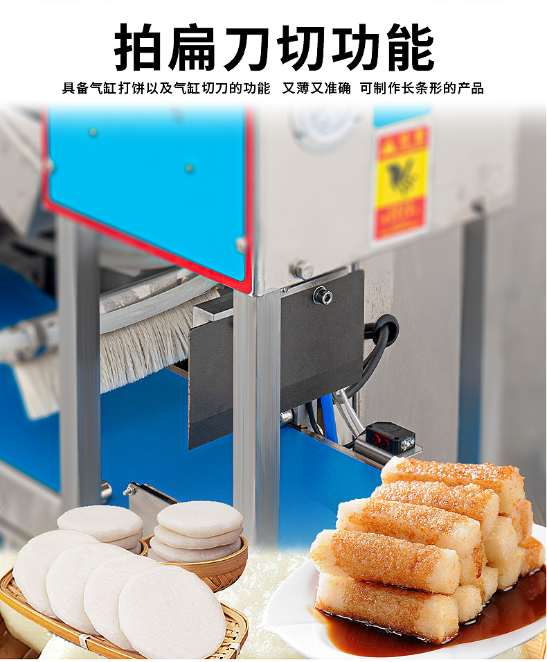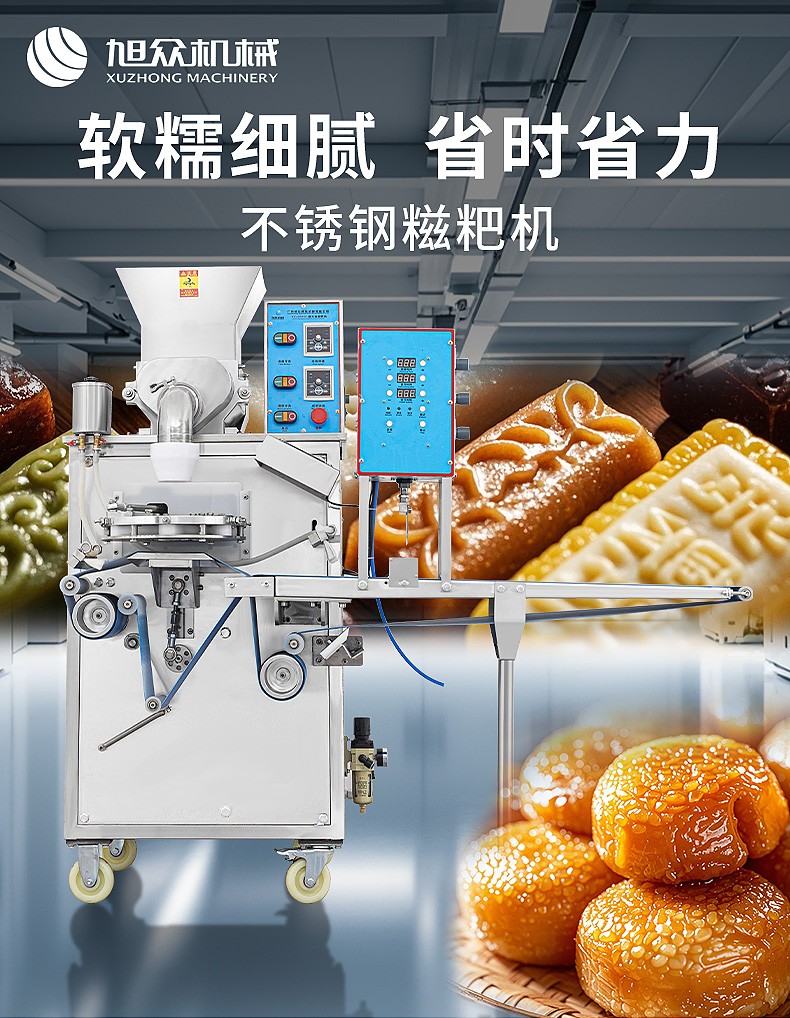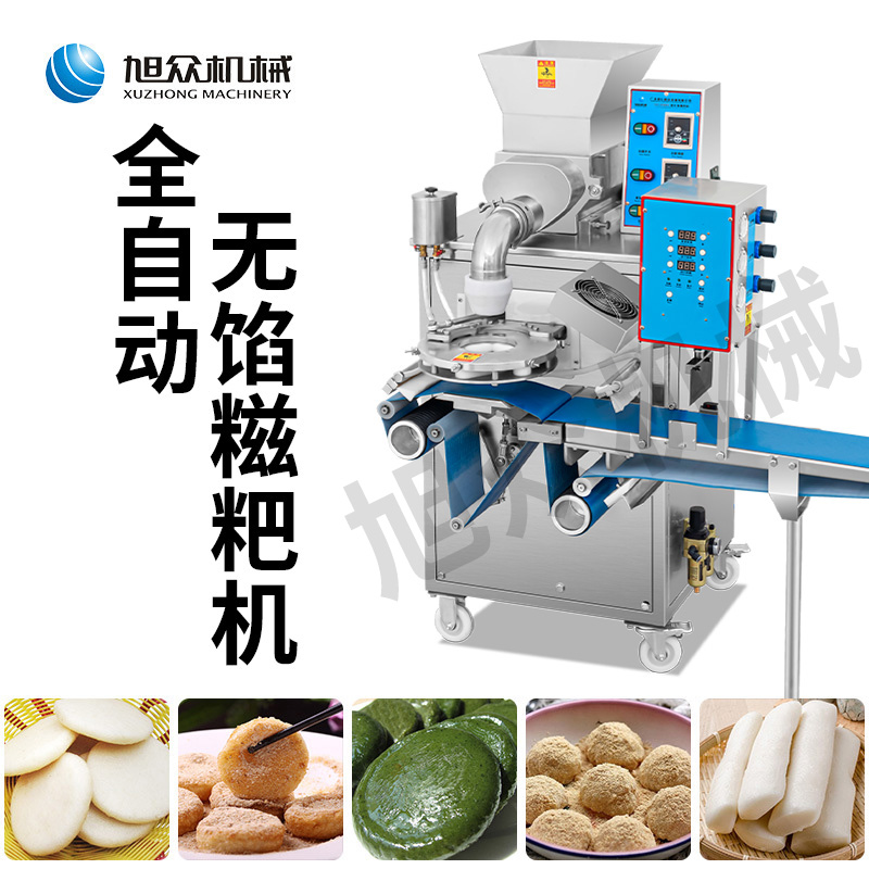 XZ-5000C糍粑机,软糯细腻、省时省力,不锈钢糍粑机。智能控制面板,智能内芯控制,可自由调节输送,切刀和打饼的时间。拍扁刀切功能,具备气缸打饼以及气缸切刀的功能、又薄又准确、可制作长条形的产品。