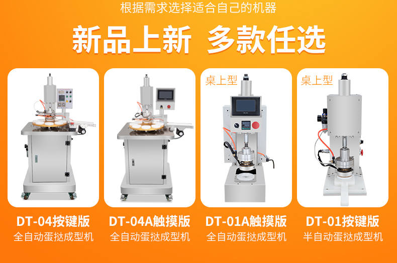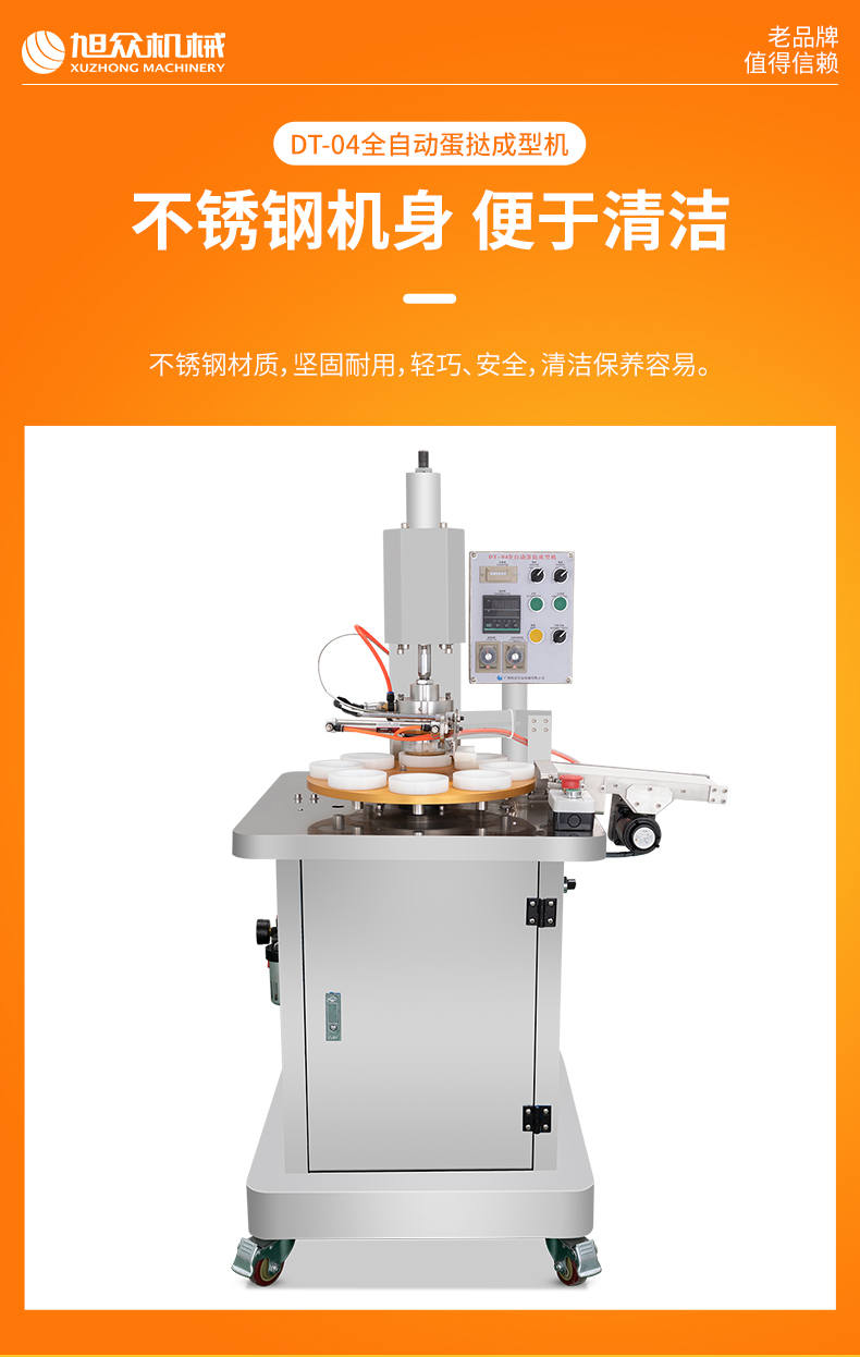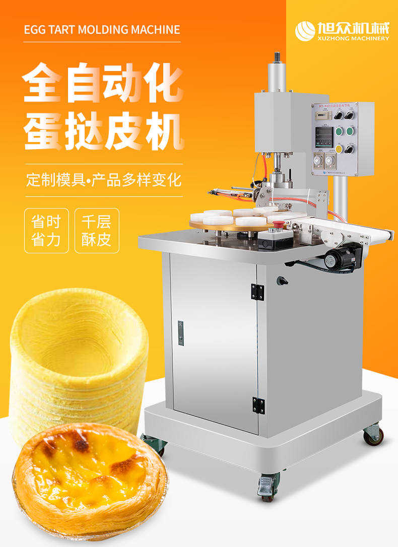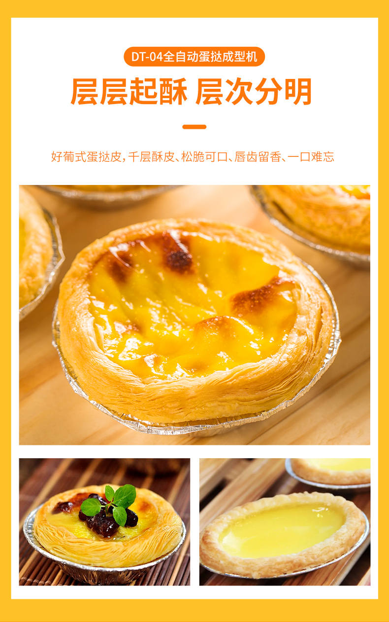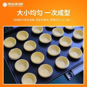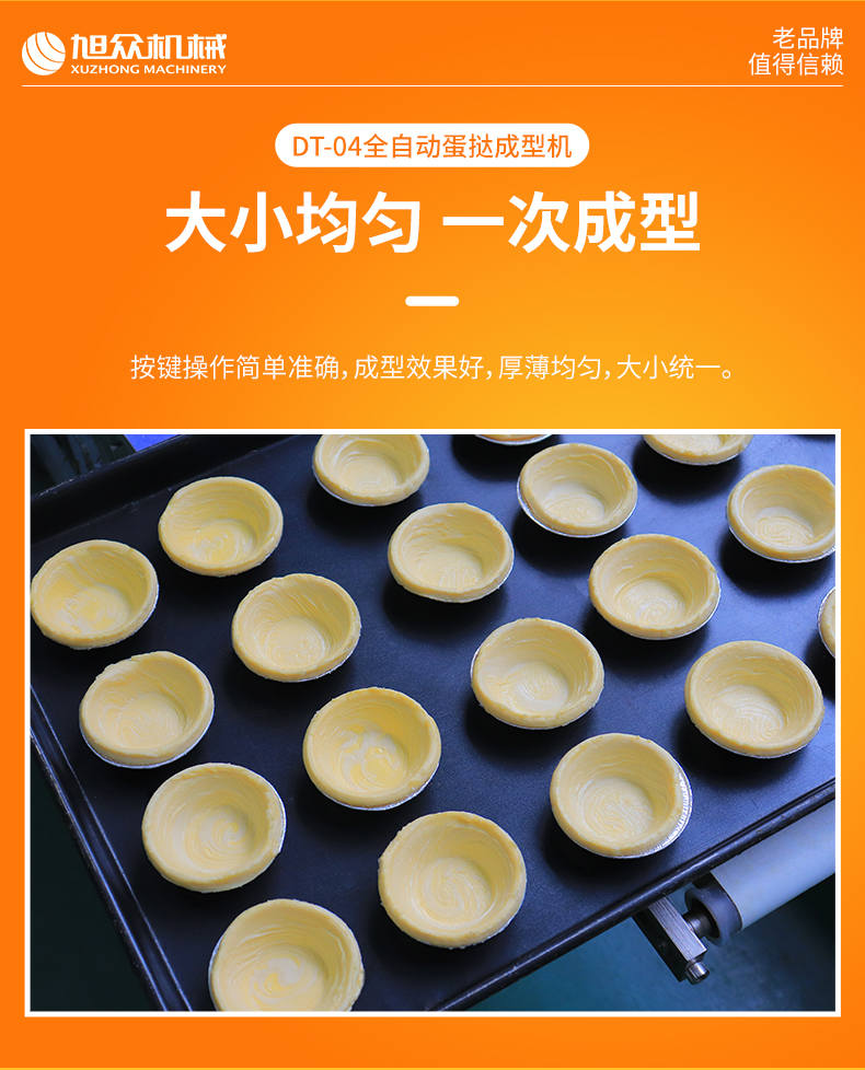 DT-04全自动蛋挞成型机,2-3秒快速成型。该机应用于传统蛋挞、葡式蛋挞及其它须印型之产品突破传统用手捏,采用微电子控制成型,一个2-3秒,高效率。大小均匀一次成型按键操作简单准确,成型效果好,厚薄均匀,大小统-。层层起酥层次分明好葡式蛋挞皮,千层酥皮、松脆可口、唇齿留香、一口难忘。
