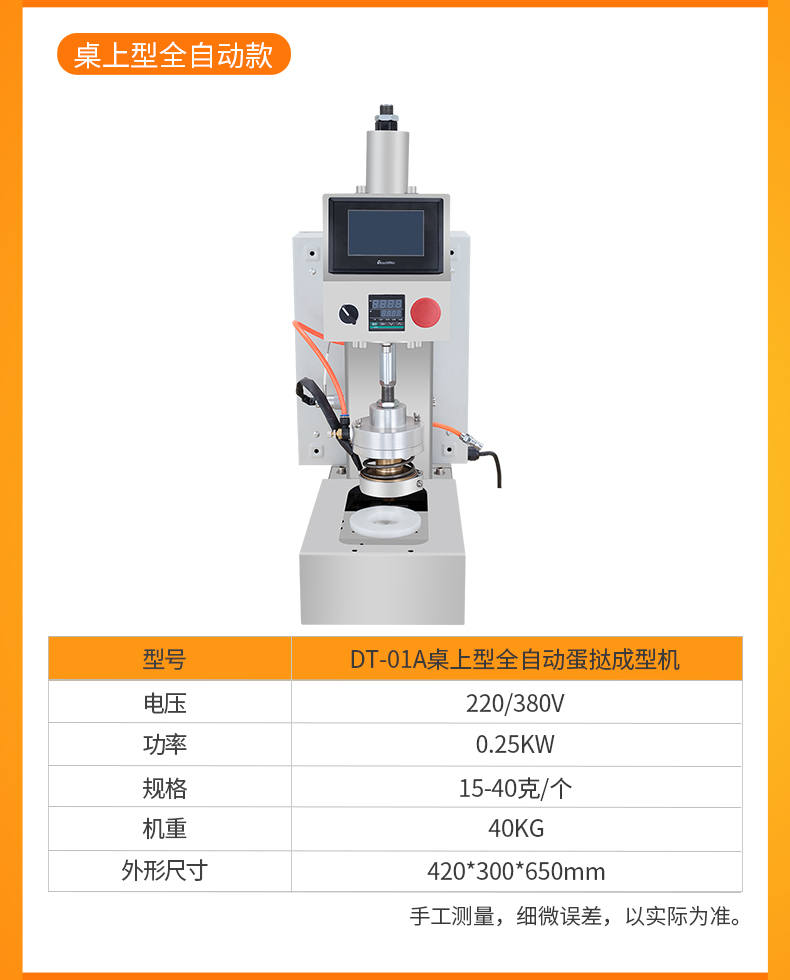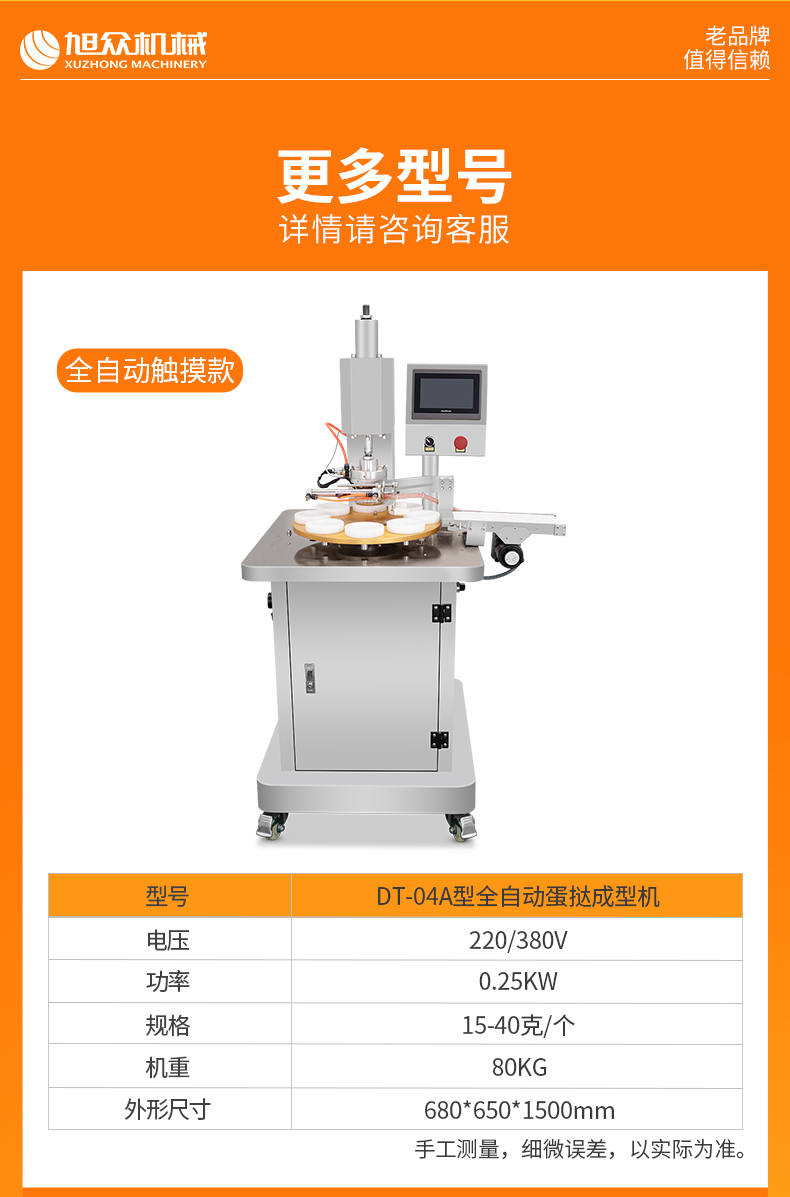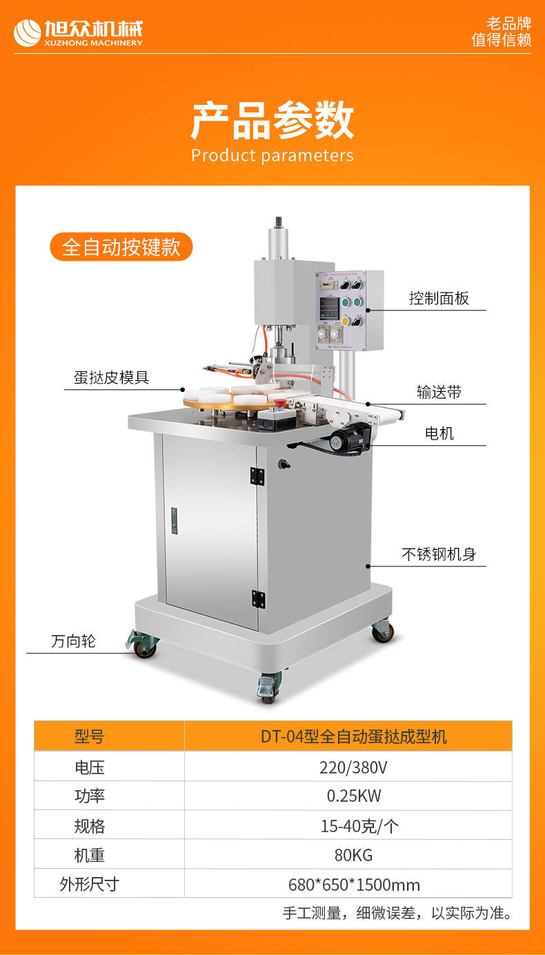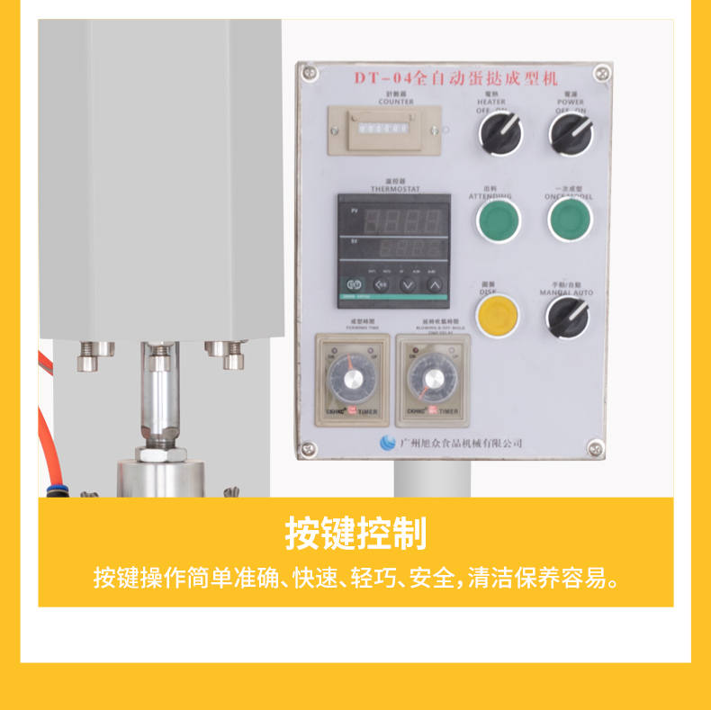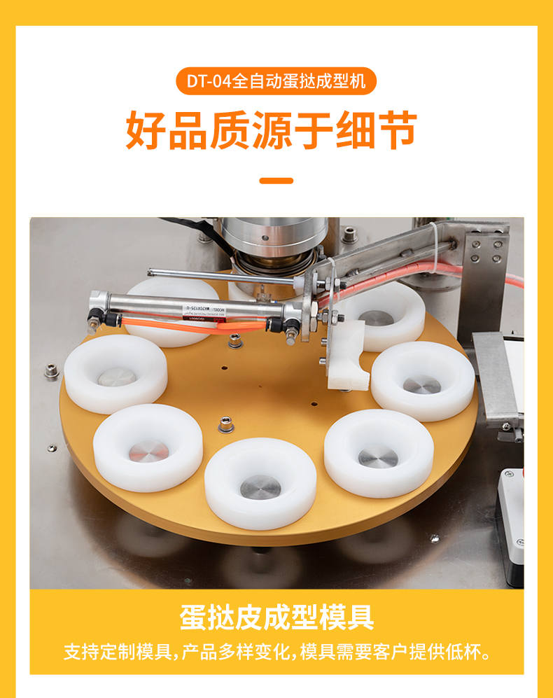 DT-04全自动蛋挞成型机,2-3秒快速成型。该机应用于传统蛋挞、葡式蛋挞及其它须印型之产品突破传统用手捏,采用微电子控制成型,一个2-3秒,高效率。大小均匀一次成型按键操作简单准确,成型效果好,厚薄均匀,大小统-。层层起酥层次分明好葡式蛋挞皮,千层酥皮、松脆可口、唇齿留香、一口难忘。