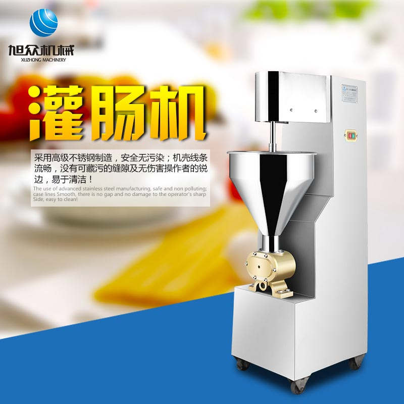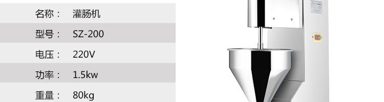 SZ-200灌肠机,适合灌制各种香肠、红肠、腊肠及糊状制品。本机使用敞开式不锈钢料斗,适用于连续添加物料;与灌装手接触部件全部采用优质不锈钢制作以防生锈;该机自动货程度高,技术先进、性能稳定、操作简便、工作效率高,具有不破坏物料成份,保质、保鲜等特点。