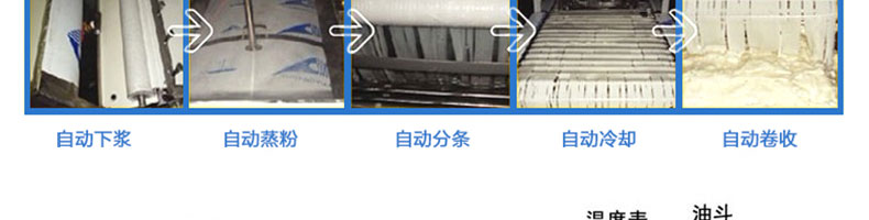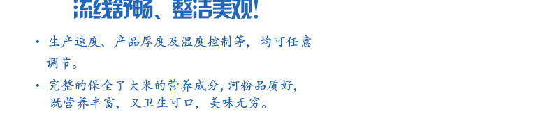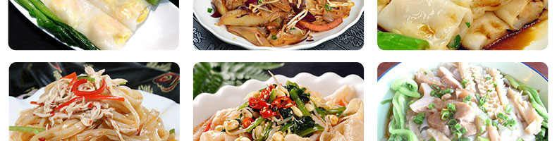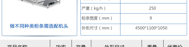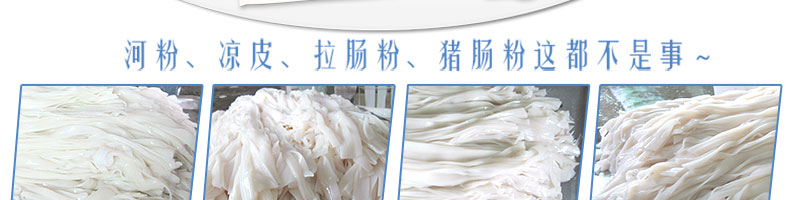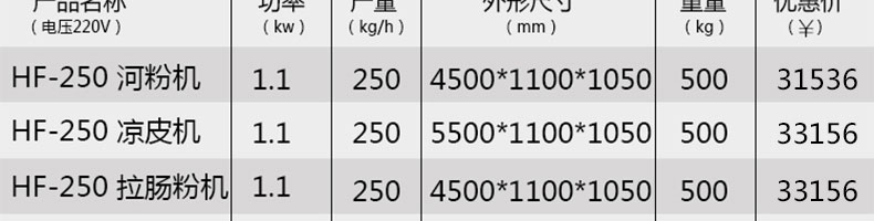 名称SZ-HF-250凉皮机 电源220/380V 功率1.1/81kw 产量100/150/200/250kg/h 尺寸主机尺寸5500*1000*1050mm 外形尺寸5600*1200*1500mm 重量500kg 规格粉条宽度mm:4/6/8/10 其他