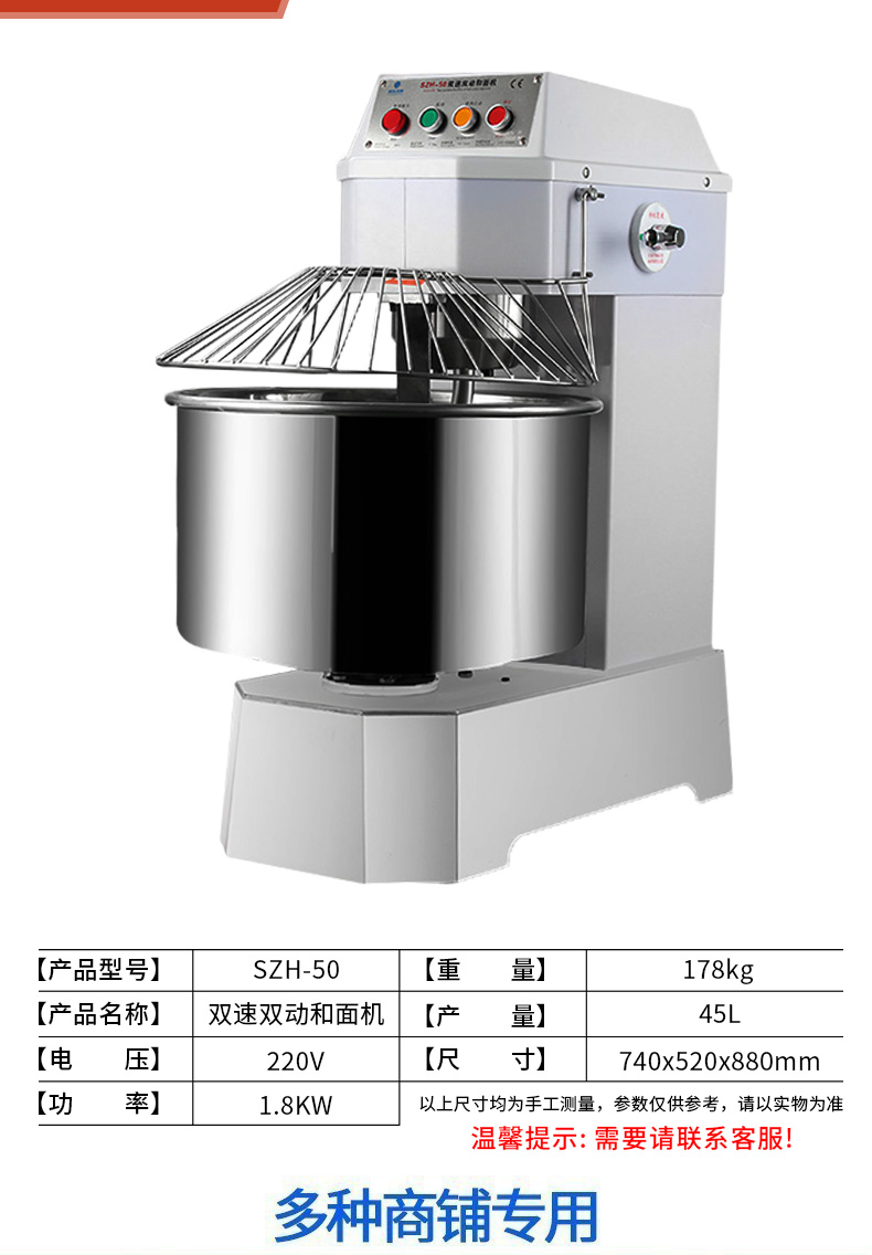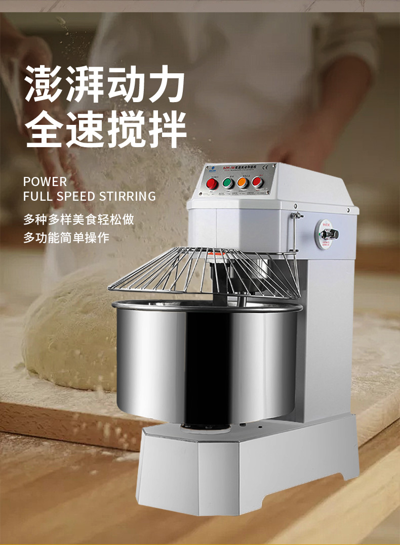 SZH-50型双速双动和面机,本机适合搅拌各种面包、包子、馒头、汤圆、披萨饼面团,专业设计避免面团过分升温并确保面团含氧量。过载、缺相保护装置,防护罩安全连动装置。