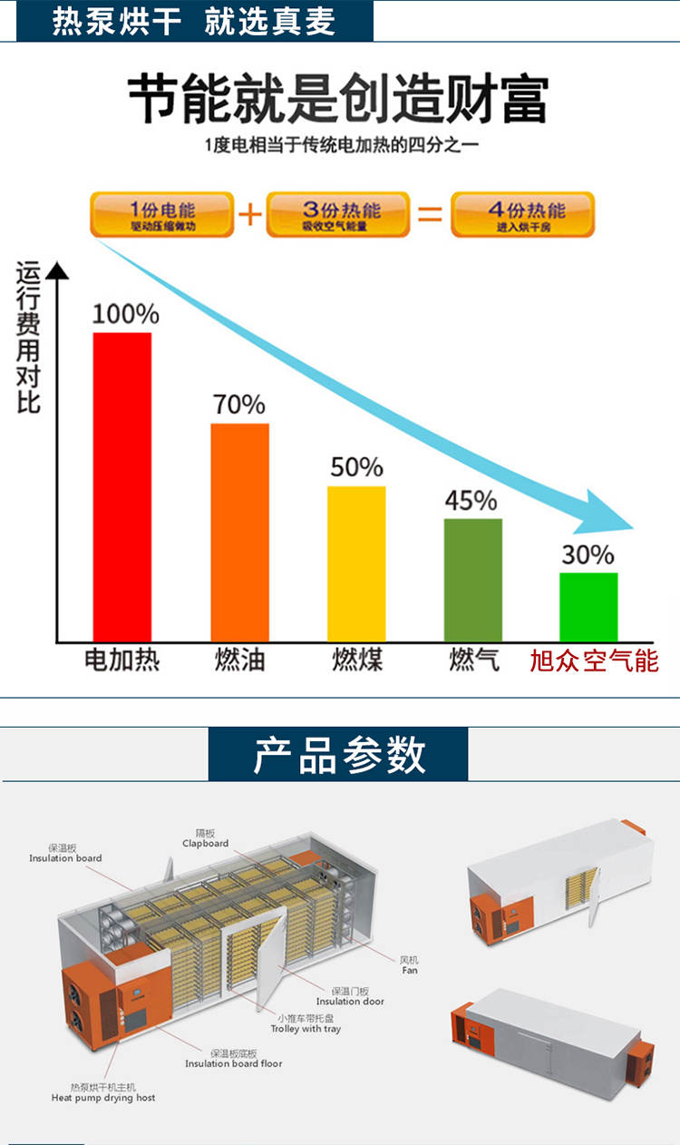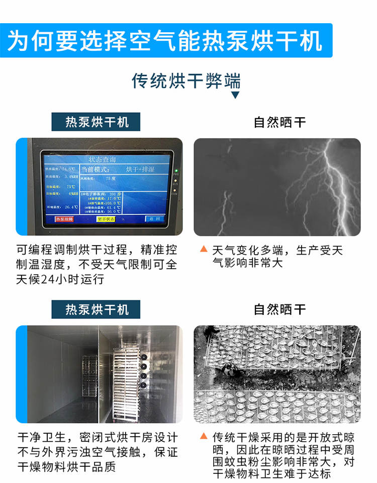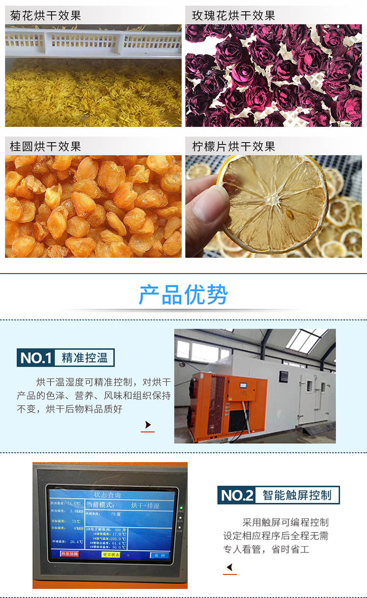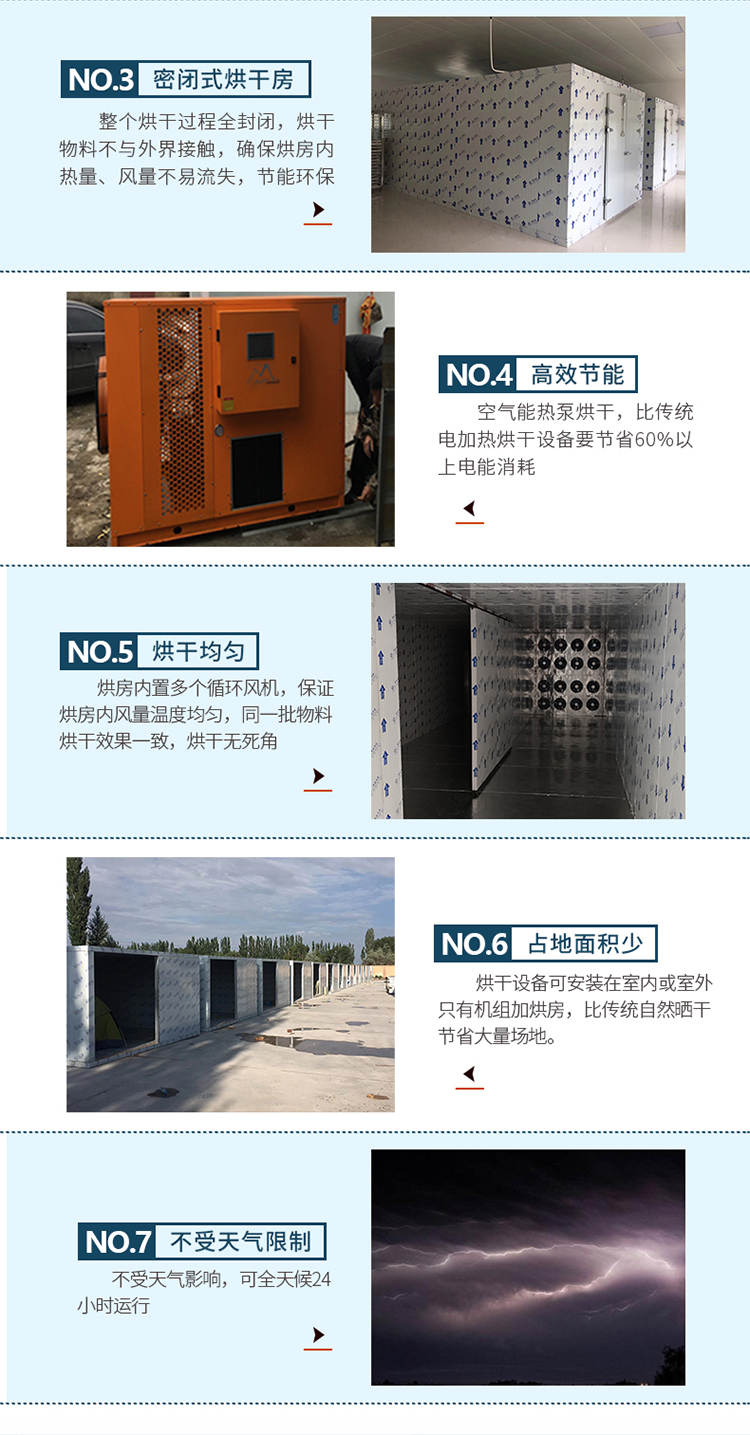 030S-T-KD06空气能烘干机,可编程调制烘干过程,精准控制温湿度,不受天气限制可全天候24小时运行。干净卫生,密闭式烘干房设计不与外界污浊空气接触,保证干燥物料烘干品质。高效节能,不用专人看守,可实现一人同时管理多间烘房减少人工费用