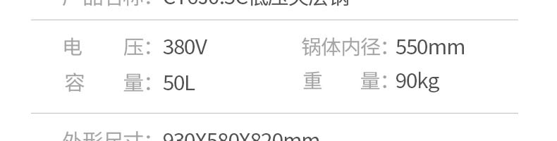 名称50型夹层锅 电源380v 功率 产量 尺寸930*580*820mm 重量90kg 规格 其他