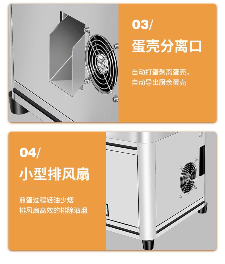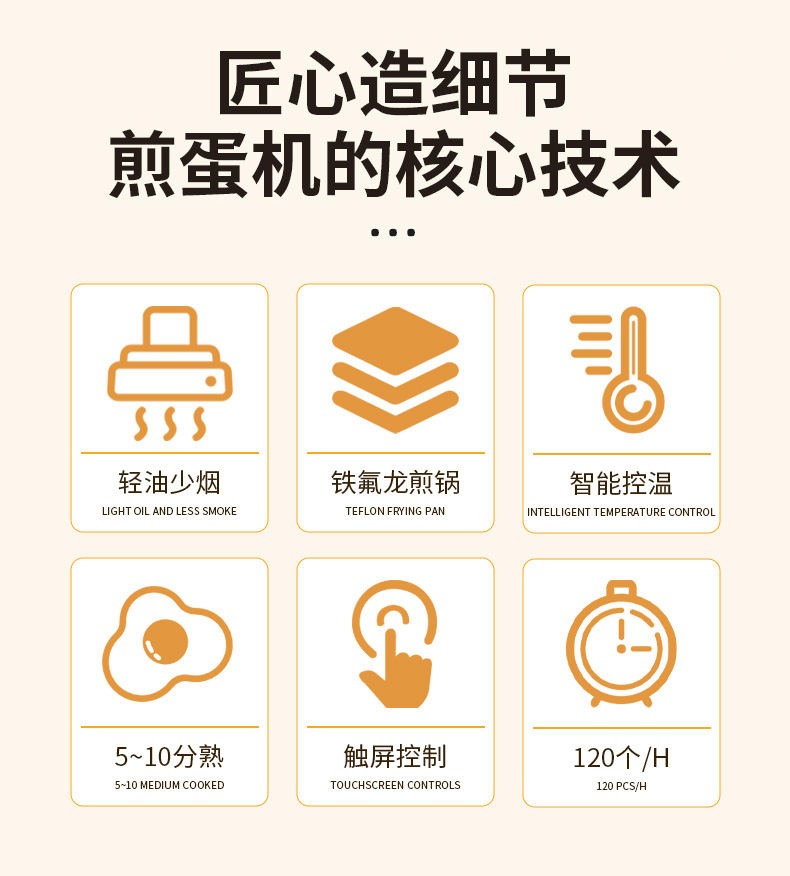 商用全自动智能煎蛋机,匠心造细节煎蛋机的核心技术,轻油少烟、5~10分熟、铁氟龙煎锅、触屏控制、智能控温。口味个性化五分/七分/十分熟,智能控温上下锅恒温煎烤。