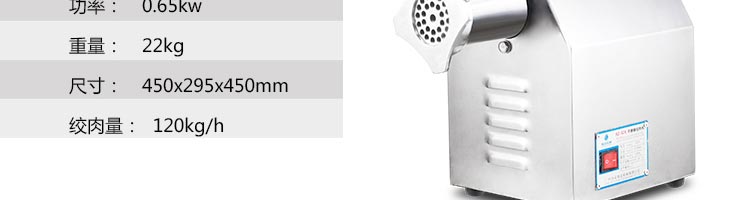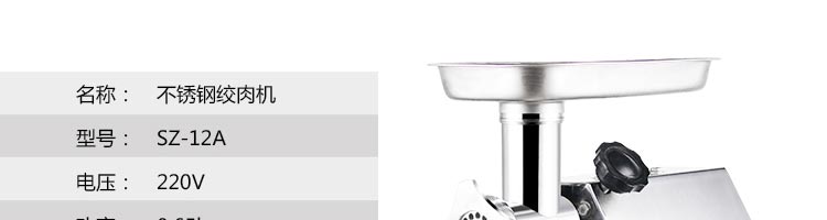 名称SZ-12A 绞肉机 电源220v 功率0.65kw 产量120kg 尺寸450*295*450mm 重量22kg 规格 其他