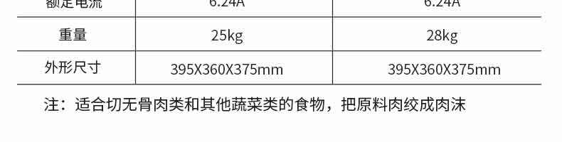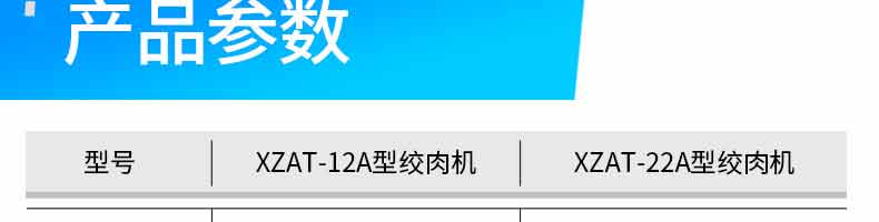 名称XZAT-22A绞肉机 电源220V/50HZ 功率850W,1100W 产量250KG/h,300KG/h 尺寸395*360*375MM 重量25KG,28KG 规格 其他