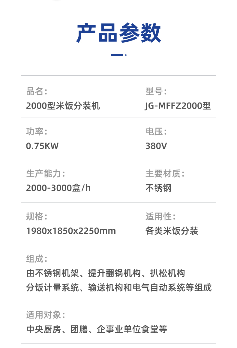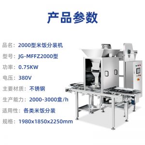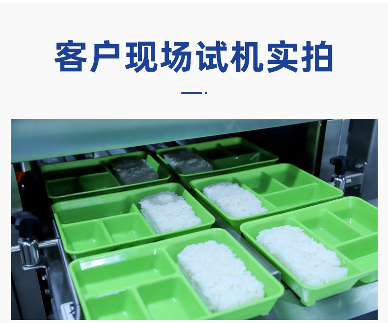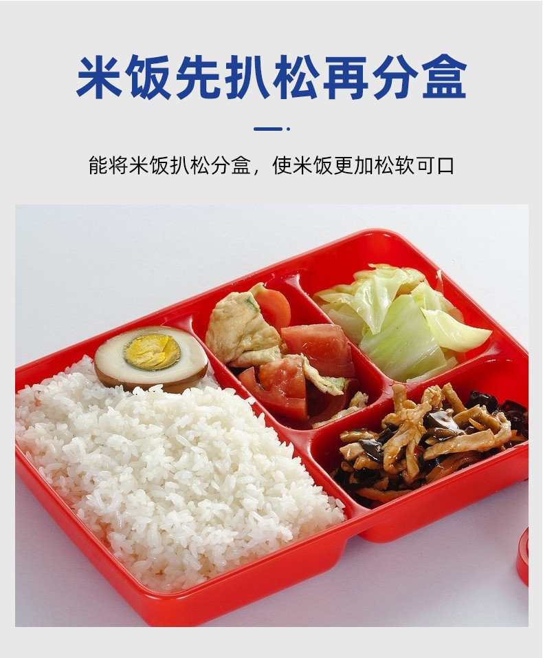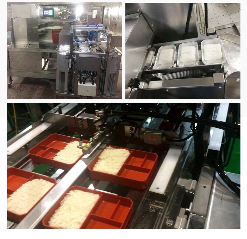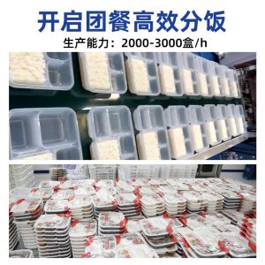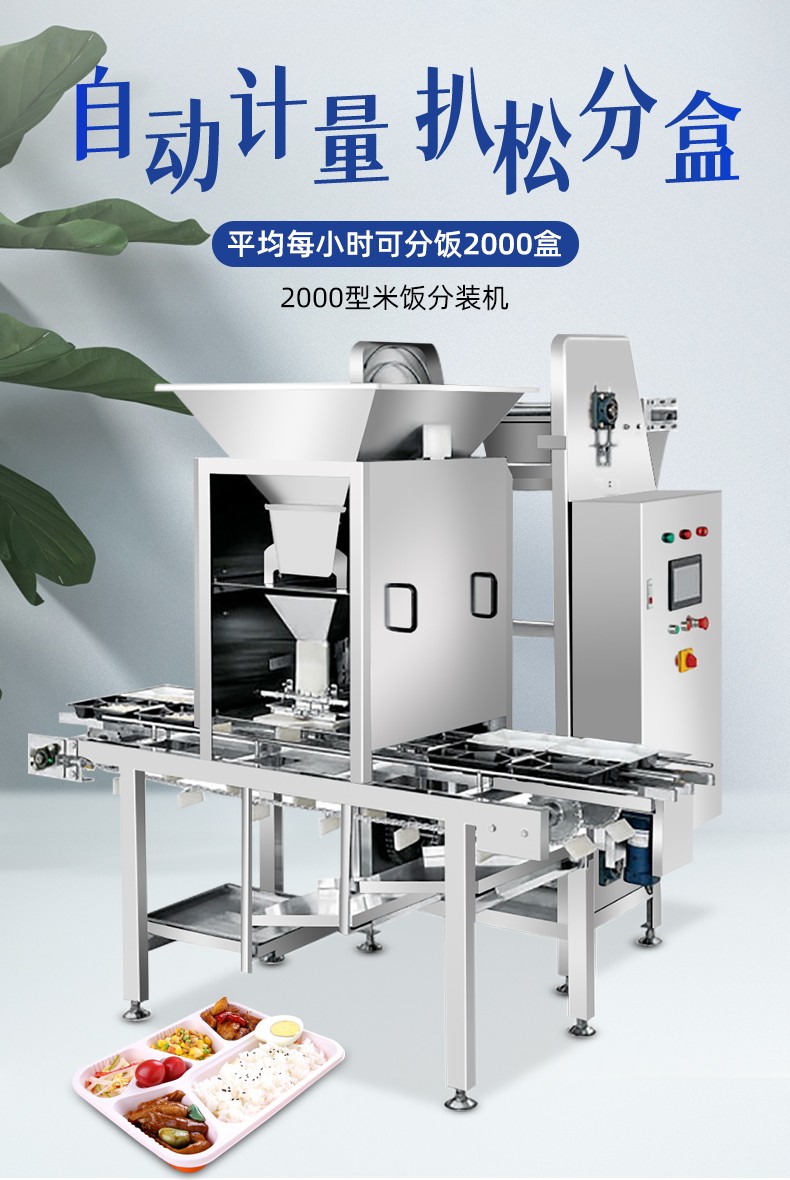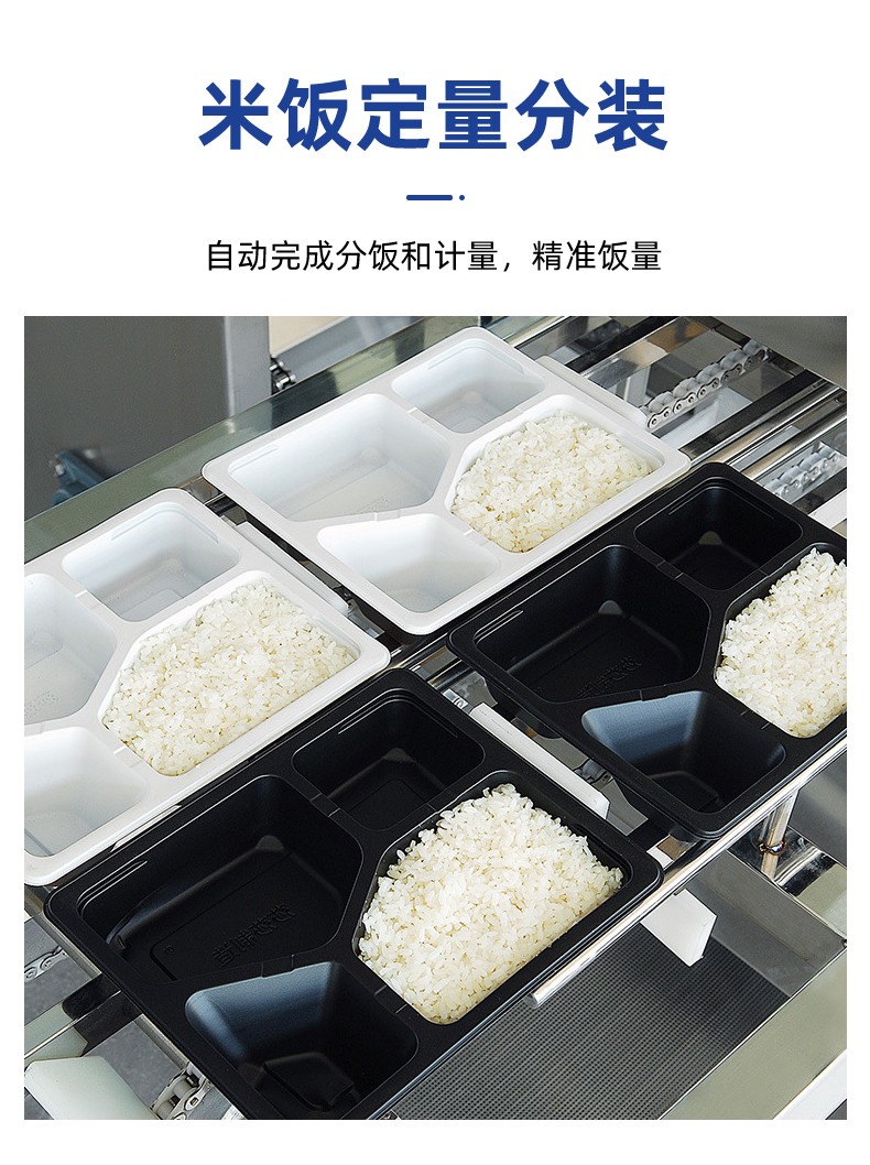 米饭分装机,适用多场合大型米饭加工中心、快餐公司、大型配餐中心企事业单位、学校食堂、酿造企业。米饭定量分装,自动完成分饭和计量,精准饭量。米饭先扒松再分盒,能将米饭扒松分盒,使米饭更加松软可口。