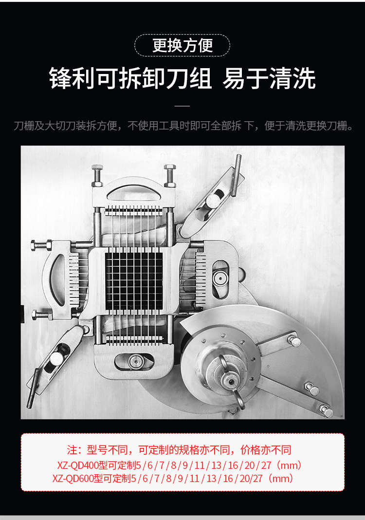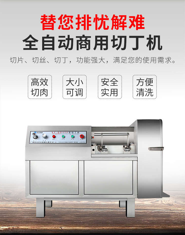 XZ-QD400切丁机,替您排忧解难全自动商用切丁机切片、切丝、切丁,功能强大,满足您的使用需求。多功能&实用人即可操作,切出自己想要的规格,满足商用多种需求。