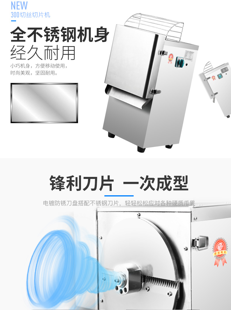 300型瓜果切丝切片机,高效便捷、一次成型、每小时可切200-300KG。全不锈钢机身经久耐用小巧机身,方便移动使用,时尚美观,坚固耐用。锋利刀片、一次成型。电镀防锈刀盘搭配不锈钢刀片,轻轻松松应对各种硬质瓜果。