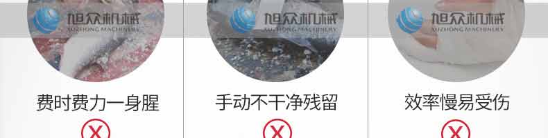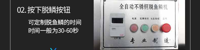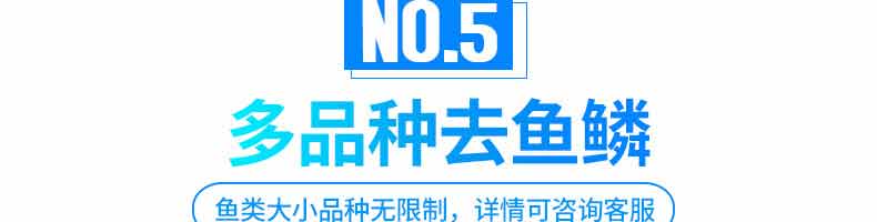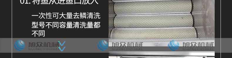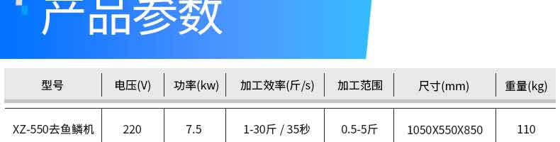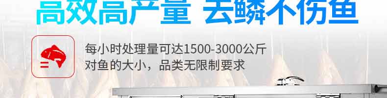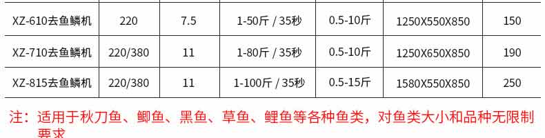 名称XZ-710去鱼鳞机 电源220V/380V 功率3.0kw/2.2kw 产量1-80斤/35秒 尺寸1250×650×850mm 重量190kg 规格 其他加工范围:0.5-10斤