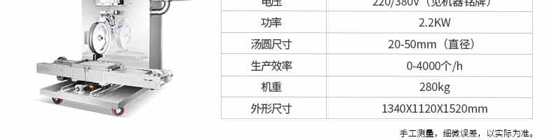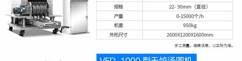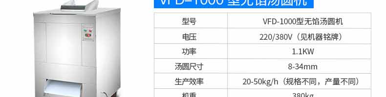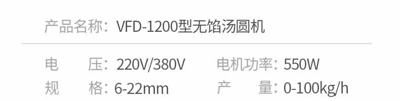 名称VFD-1200无馅汤圆机 电源220/380V 功率0.55KW 产量50-100kg/h 尺寸1350*900*850mm 重量220kg 规格 其他