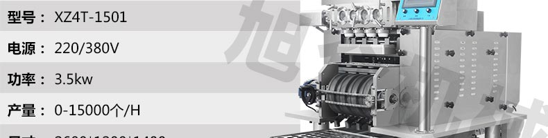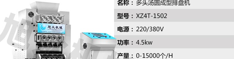 名称XZ4T-1501多功能搓圆摆盘机/汤圆机 电源220/380V 功率3.5kw 产量0-15000个/小时 尺寸外形尺寸2600*1200*1400mm 重量800kg 规格20-30mm(直径) 其他
