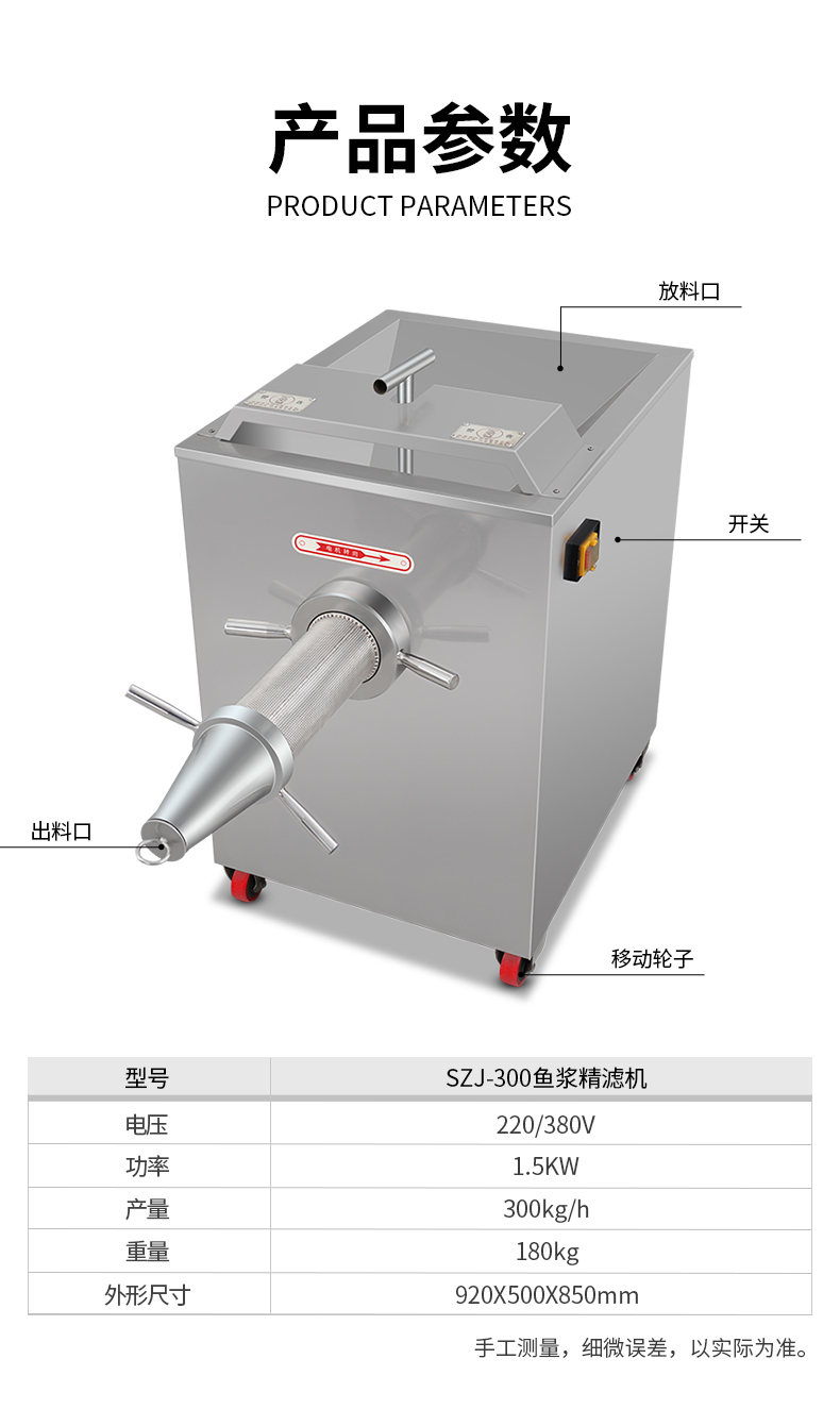 名称SZJ-300鱼浆精滤机 电源220/380V 功率1.5KW 产量300kg/h 尺寸920X500X850mm 重量180k 规格联系销售员 其他