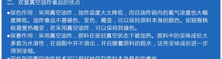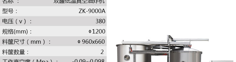 zk-1200双罐低温真空油炸机,适用于水果类、蔬菜类、干果类、水产品机畜禽肉类等。油炸食品不易褪色、褐色,可以保持原料本身的颜色